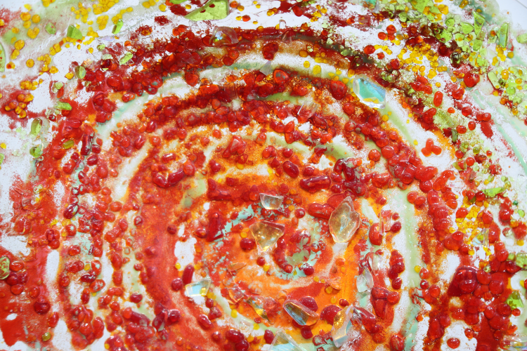 Kissinger’s work is kiln-formed, although she has done some work in all glass mediums. She has four kilns in her garage, which she uses for smaller pieces. For bigger projects, she uses kilns made available to her through the courtesy of others. She also has a small studio in Clarksville, but dreams of a studio big enough to accommodate all of her projects.