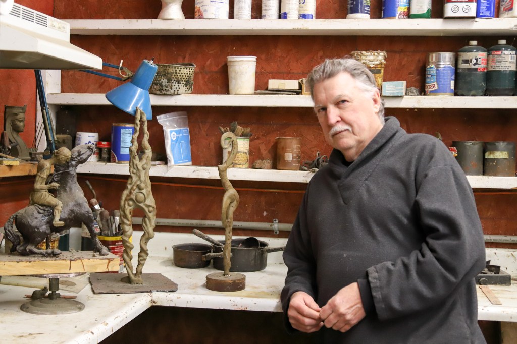 Some of Cox’s ideas come from books. He is an avid reader, with a floor-to-ceiling library that stretches the length of his living room. His sculpture “Jherek” is based on a character in Michael Moorcock’s science fiction trilogy “Dancers at the End of Time.” “The sculpture is pure fantasy,” Cox said.