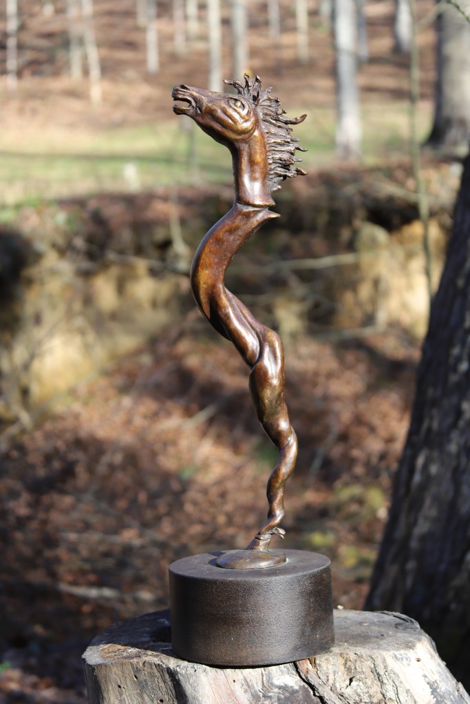 The more imaginative side of Cox’s work happens when he creates his clay sculptures. These shapes arise, he said, “from looking at the world askance rather than directly. I am open to shadows and forms that appear out of the corner of my eye. They seem to come out of ether.” In his sculptures “Leap” and a horsehead that is “Untitled,” he seems to sculpt movement itself. There is so much swirling and flowing vitality in these sculptures that the viewer might feel lighter – freer to move and transcend limitations – after seeing them.