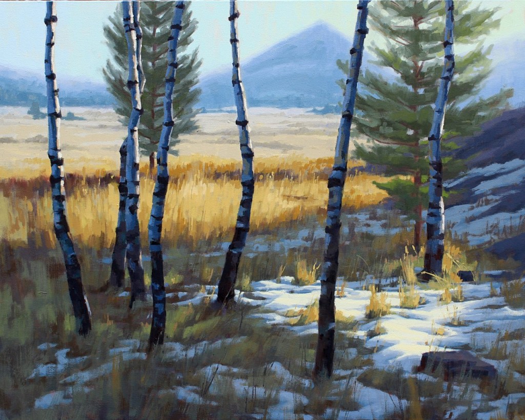 On a trip to Rocky Mountain National Park in Colorado, Laux made the sketches and notes for her painting “Quiet in the Crowd,” which portrays a scene in a section known as Moraine Park. In the painting, the light falling on the trunks of the Aspen trees and on the distant mountain peak is balanced by the triangle of sun-lit snow in the shadowed foreground.