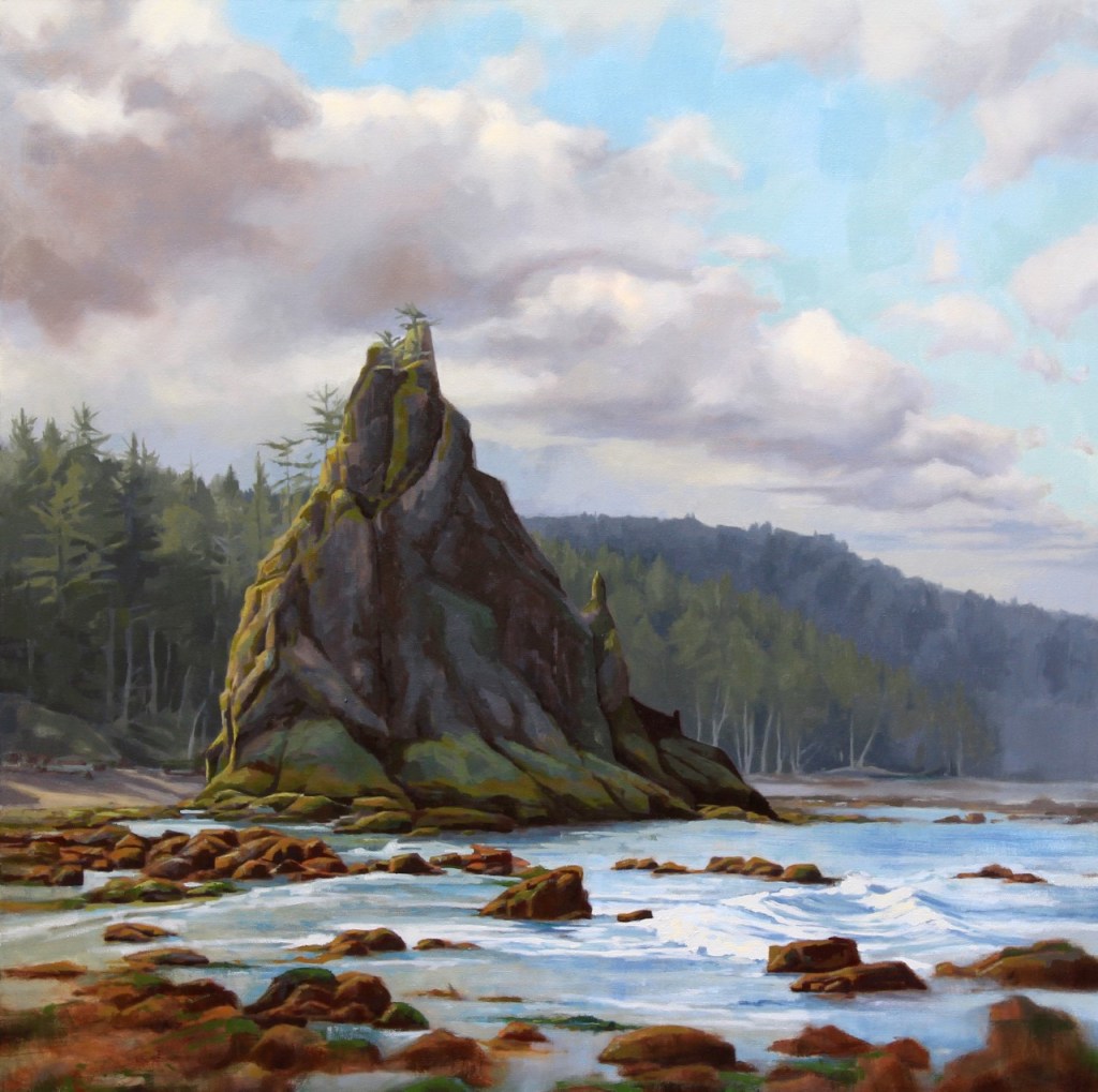 Laux, of course, takes her sketchpads, paints and camera, and has made dozens of beautiful paintings of scenes from their travels. Her painting “Rialto Beach” is of the west coast side of Olympic National Park in Washington state.