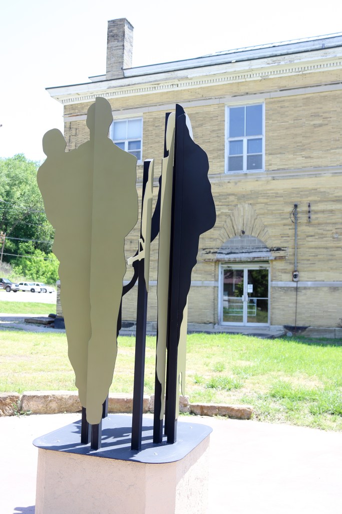 Perry County’s Veteran’s Park, located beside the County Museum in downtown Cannelton, is the site of one of Harris’s more recent sculptures, “Together We Serve.” Made of powder-coated steel, Harris designed this work as a tribute that recognizes the sacrifices, not only of soldiers, but of their families. Viewed from the front, a soldier with a weapon is prominent. Created with a loose-fitting uniform, the soldier’s gender is not recognizable. This soldier is flanked by a father and child, which can be seen when viewed from the side, and a mother and child on the other side. The sculpture serves to keep the struggles of the entire military family alive in our consciousness, reminding us that those who serve do not serve alone.