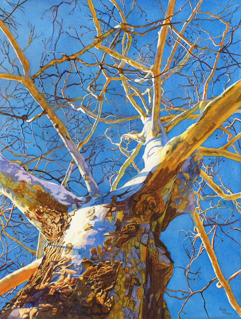 “Rise Up” is a painting of bare white sycamore branches against a bright blue winter sky filled with light that cascades over the tree, revealing minute details of the bark.